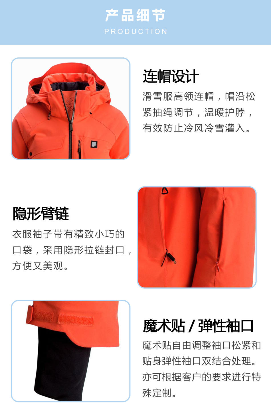 • 隱形臂鏈保暖滑雪服生產出衣服的袖子帶有精致小巧的口袋,采用隱形拉鏈封口,方便又美觀。